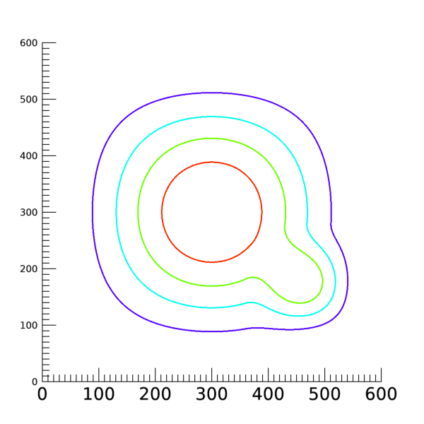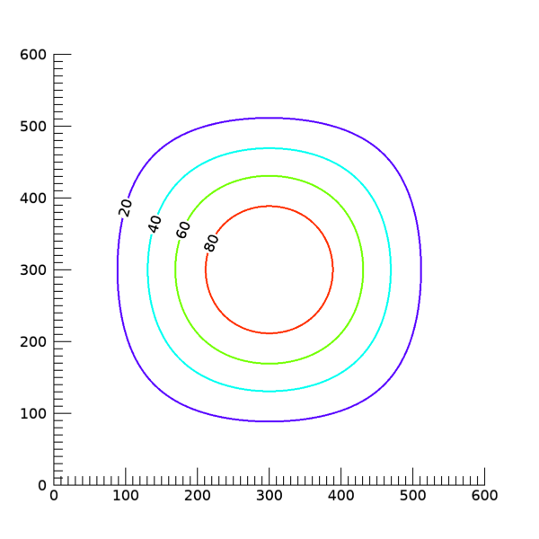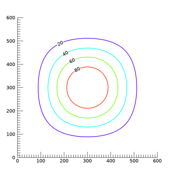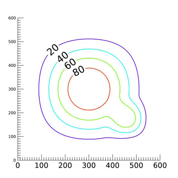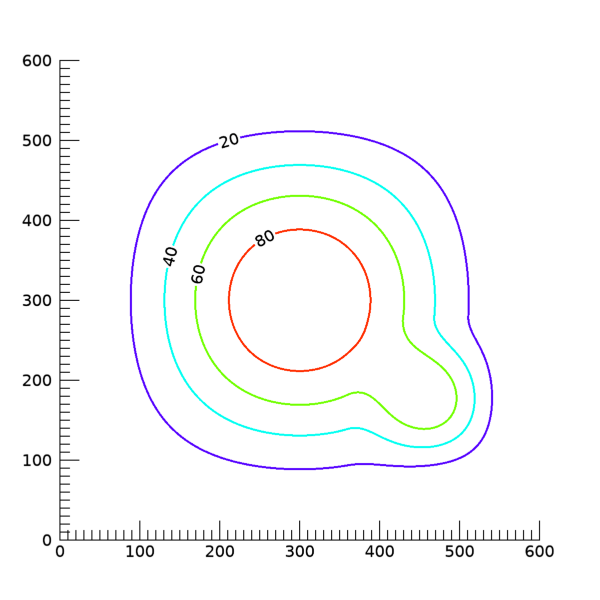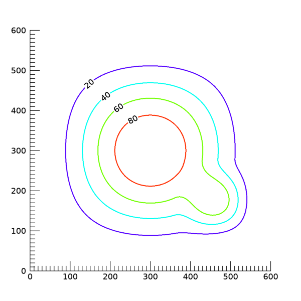 이렇게 하면 4개의 등위선들 중 세번째, 즉 값 60에 대응되는 등위선에 대해서만 라벨 문자가 나타나지 않도록 처리됩니다. 즉 각각의 등위선 별로 개별적인 설정이 가능합니다. 위의 그림을 얻는 과정에서 C_LABEL_SHOW 속성만 이렇게 변경한다면, 다음과 같은 그림을 얻게 됩니다.