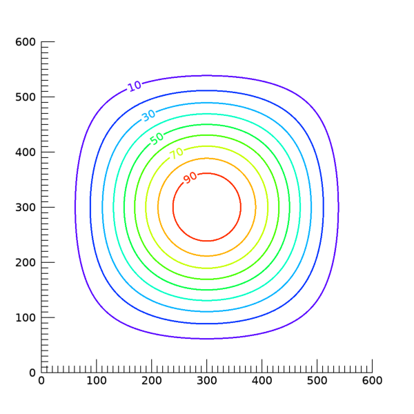 여기서는 배열 구조가 600x600이고 값 범위는 0~100인 가상의 2차원 데이터를 생성하고, 이 데이터 배열을 CONTOUR 함수에 투입하여 등위선 형태로 표출하였습니다. 특히 값의 고저에 따른 색상 적용을 위하여 34번 컬러테이블을 적용하였습니다. 이대로 실행하면 다음과 같은 그림이 표출될 것입니다.