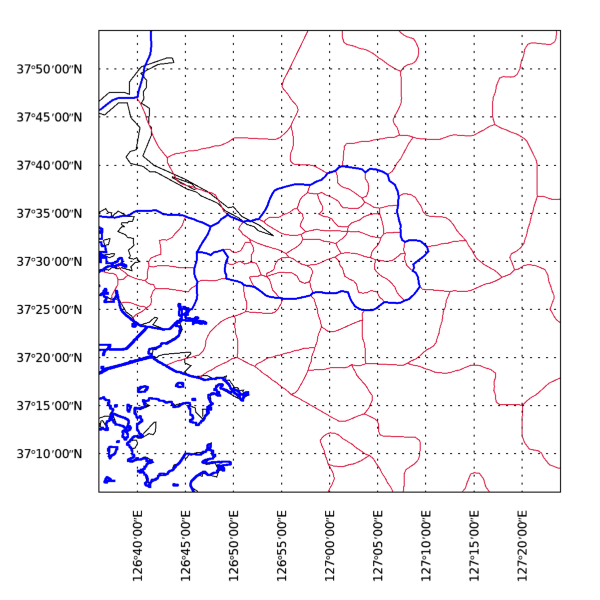 여기서는 서울시 및 근방을 나타내기 위하여 limit에 명시된 경위도 범위값들을 적절하게 조정하였습니다. 그리고 MAPCONTINENTS 함수를 이번에는 총 3회에 걸쳐서 사용하였습니다. 이들 중 mc는 그대로이고 mck2는 시군구 경계선을 붉은색으로 그리고 mck1은 도경계선을 파란색으로 좀 두껍게 표시하도록 한 것입니다. 이 내용을 실행하면 다음과 같은 그림이 표출될 것입니다.