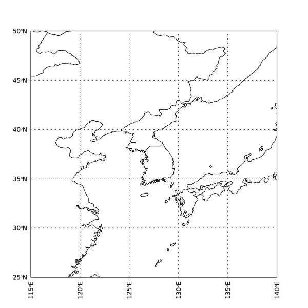 여기서는 경위도 범위를 한반도를 중심으로 하여 25도x25도의 영역을 커버하도록 설정하였습니다. 그리고 MAPCONTINENTS 함수에서 /COUNTRIES라는 키워드가 사용되었는데, 이 키워드가 바로 국가경계선을 표시하는 역할을 합니다. 이 내용을 실행하여 표출된 그림은 다음과 같습니다.