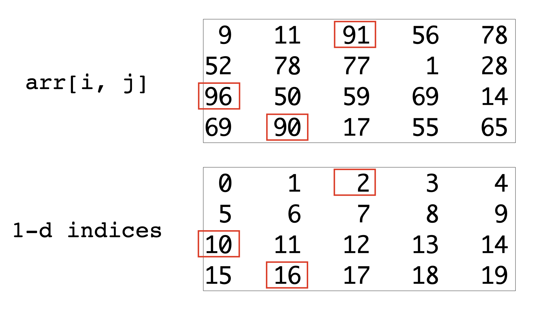 즉 1차원 인덱스 2는 2차원 인덱스 (2, 0)에 해당되고, 1차원 인덱스 10은 2차원 인덱스 (0, 2)에 해당되고, 1차원 인덱스 16은 2차원 인덱스 (1, 3)에 해당된다는 의미입니다. 물론 ww의 모든 1차원 인덱스들에 대하여 한꺼번에 결과를 얻을 수도 있습니다.