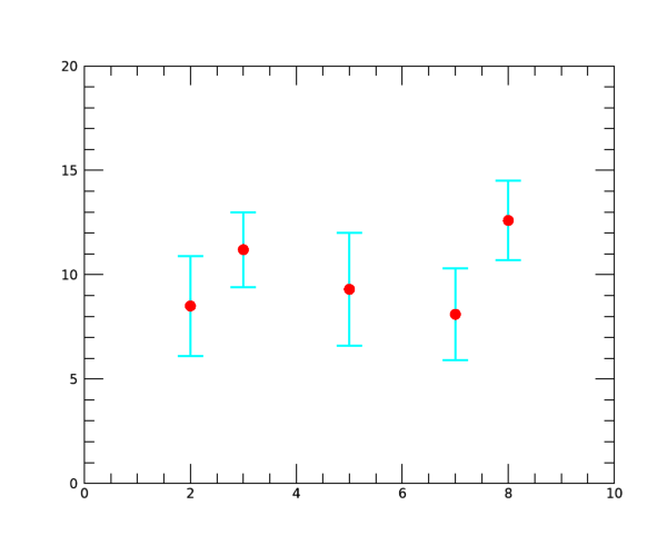 그런데 이 그림을 보면 뭔가 좀 개운치 않은 부분이 있습니다. 바로 심볼이 에러바 선에 의하여 가려진 것입니다. 그로 인하여 심볼 자체가 갈라진 것처럼 보입니다. 여기서 심볼의 색상은 'red'로 하였고 에러바 선의 색상을 'cyan'으로 하였는데 색상대비로 인하여 이러한 문제가 더 두드러져 보입니다. 이처럼 ERRORPLOT 함수 자체적으로 심볼을 표시하는 기능이 지원되긴 하지만, 이 기능을 사용할 경우에는 심볼이 선에 가려지는 문제가 있습니다. 아마도 ERRORBAR 함수 자체의 기능만으로는 이러한 문제를 피할 방법은 없는 것 같다는 것이 제 생각입니다.