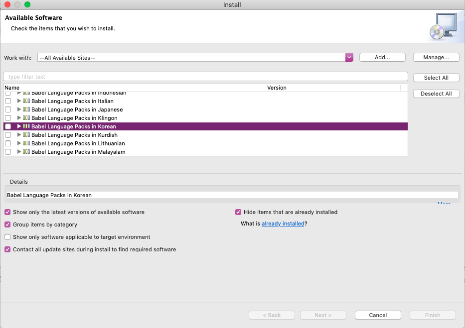 이렇게 항목을 선택하면 아마 약간의 시간 동안(네트웍 상태에 따라 달라질 수 있습니다) 서치를 한 뒤에 다음과 같이 목록창에 다수의 항목들이 나타날 것입니다. 여기서 항목들을 보다보면 다음 그림과 같이 Babel Language Packs in Korean이라는 항목이 보일 것입니다. 여기서 한가지 재미있는 것은 Korean 바로 위에 Klingon이란 항목이 보이는데요. 아시는 분들은 아시겠지만 스타트렉(Star Trek)이라는 SF 영화/드라마에 등장하는 외계종족인 Klingon 족의 언어입니다(아마 미드 빅뱅이론을 보신 분들도 익숙하실 것 같습니다). 이게 실제로 어엿한 언어 체계를 갖고 있다고 합니다. 궁금하신 분들은 받아서 설치해보셔도 됩니다(저는 안해봤습니다).