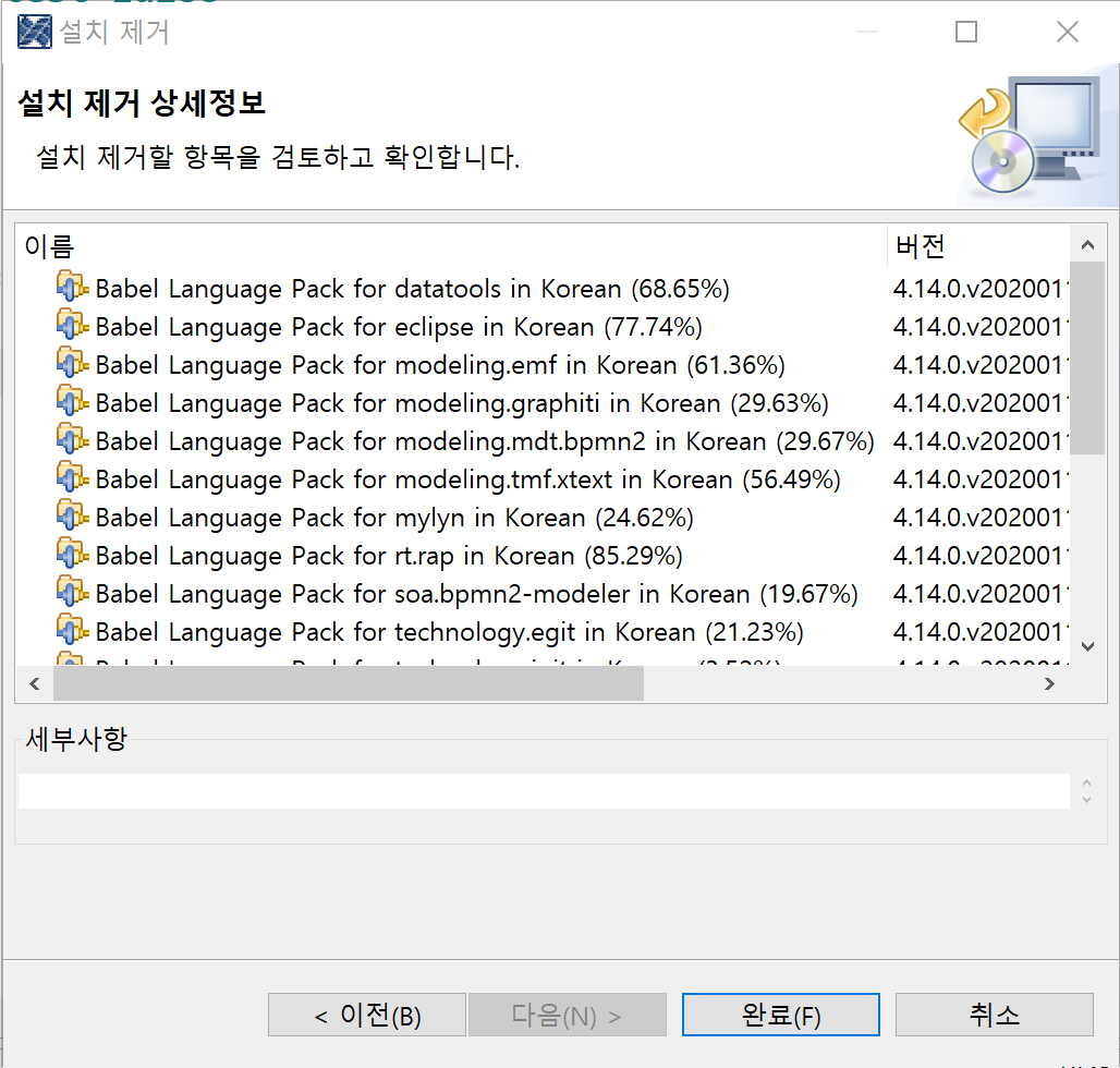 그러면 다음과 같이 "설치 제거 상세정보"를 보여주는데 여기서 "완료" 버튼을 누르면 제거가 시작됩니다.