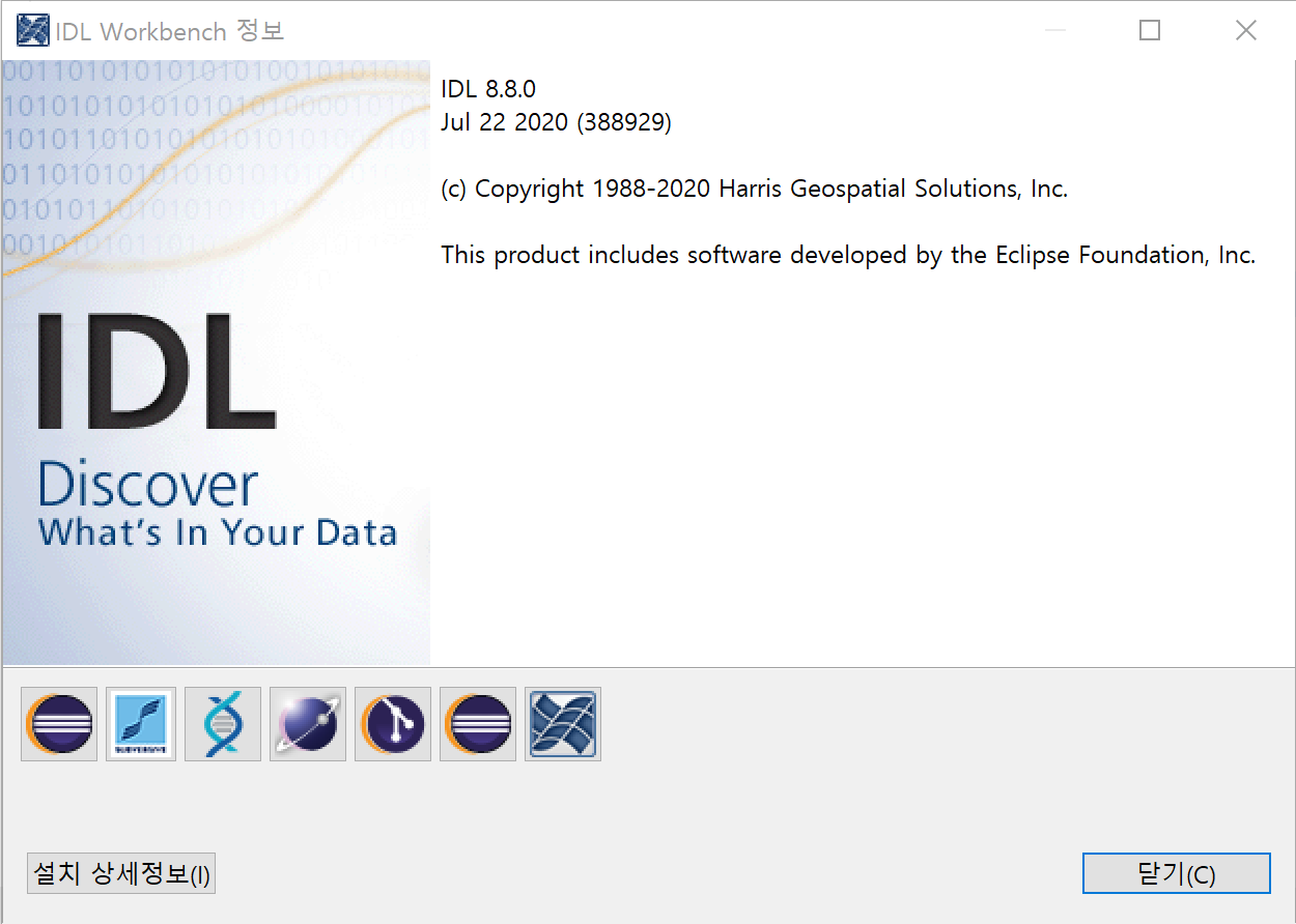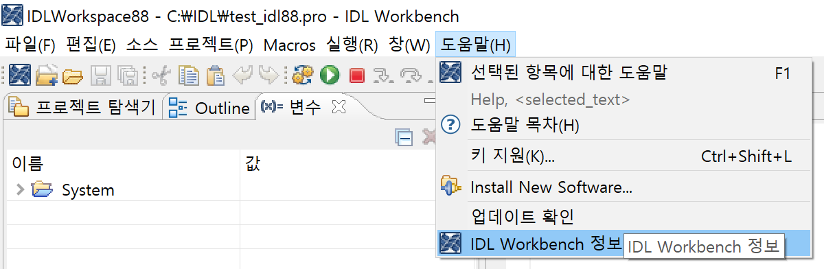 먼저 IDL 8.8 워크벤치의 메뉴바에서 "도움말 -> IDL 워크벤치 정보" 버튼을 누릅니다.