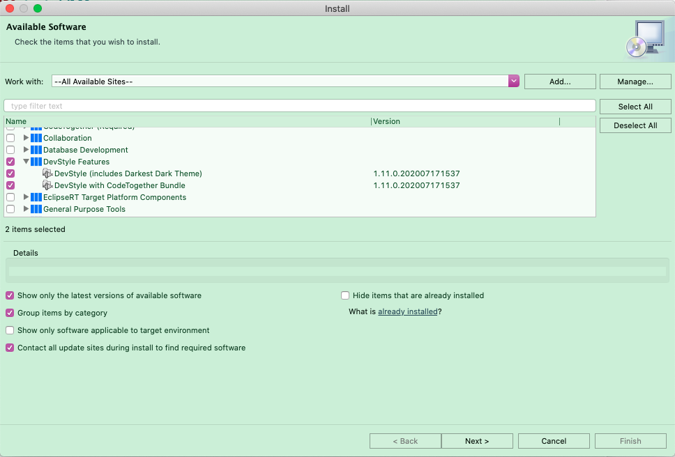 DevStyle 플러그인의 경우도 다운로드 및 설치를 위해서는 앞서 언급한 게시물에서 소개되었던 방법대로 "Help -> Install New Software" 버튼을 눌러서 진행하면 됩니다. 이 설치 가능한 플러그인들의 목록에서 DevStyle이란 항목을 선택하여 설치하면 됩니다.