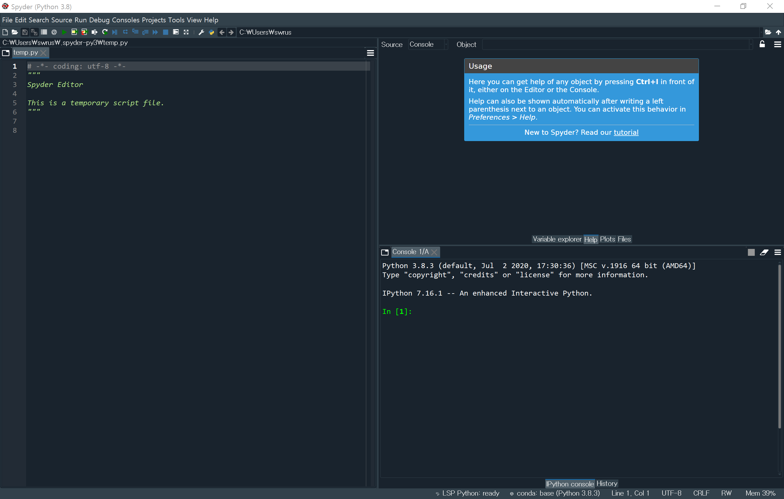 물론 pythonpath에 이와 같은 항목들을 추가하는 방법은 사용환경에 따라 약간 다를 수 있습니다. 한가지 방법은 앞서 언급했던 Anaconda 패키지를 설치하면 제공되는 Spyder라는 개발환경 GUI를 실행해서 설정하는 것입니다. 이 Spyder는 마치 IDL의 개발환경인 IDLDE와 비슷한 느낌인데, 최근의 모습은 다음 그림과 같습니다. 요즘은 IDL도 그렇고 이렇게 Dark mode라고 하는 어두운 화면 모드를 제공하는 것이 일반적인 것 같습니다.