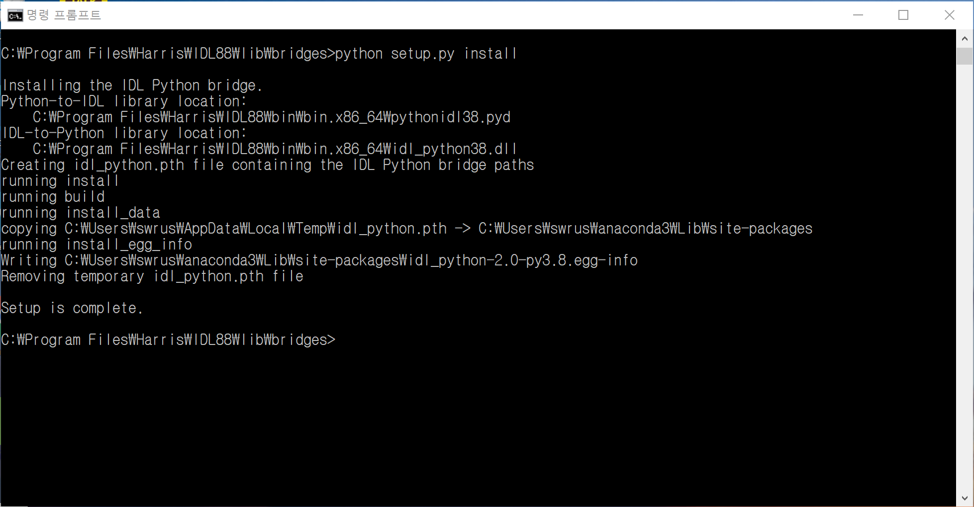 이제 마지막 과정으로서 setup.py 파일을 실행해줘야 합니다. 이 작업은 cmd 프롬프트 상에서 해야 합니다. 다음과 같이 cmd 프롬프트에서 cd 명령을 사용하여 IDL 설치 디렉토리의 lib\bridges 디렉토리로 이동합니다.