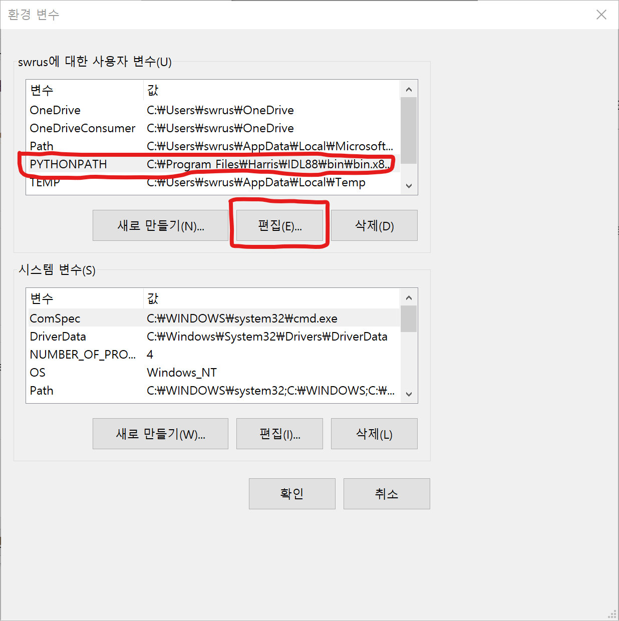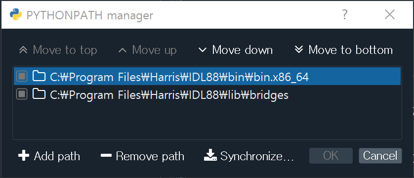 4개 항목 각각의 내용은 사용자의 PC 내에서 IDL과 Python이 설치된 디렉토리 경우에 따라 위의 것들과는 약간 차이가 날 수도 있습니다. 각자의 상황에 맞게 수정하여 추가하면 됩니다. 새로운 항목들이 추가된 모습의 예는 다음과 같습니다 (제 PC에서의 모습입니다).