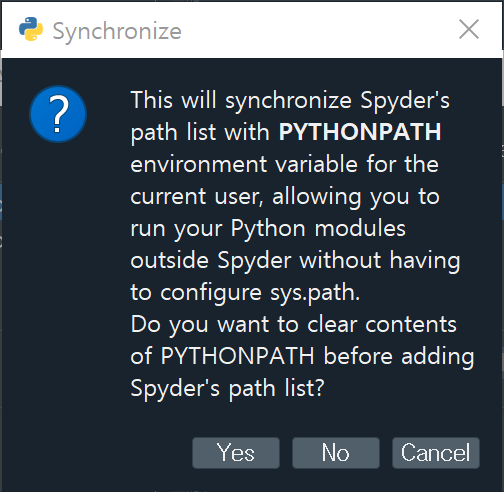 그런데 Spyder 환경으로 한정짓지않고 그 외의 환경들(cmd 프롬프트나 python, ipython과 같은 텍스트 기반의 환경 등)에서도 위의 경로들이 적용되도록 하는 것도 필요합니다. 특히나 우리는 IDL-Python Bridge 기능을 셋업하는 중이기 때문입니다. 이러한 추가적인 설정을 위해서 PYTHONPATH manager 상에서 'Synchronize'라는 버튼을 누릅니다. 그러면 다음과 같은 메시지 팝업창이 뜹니다.