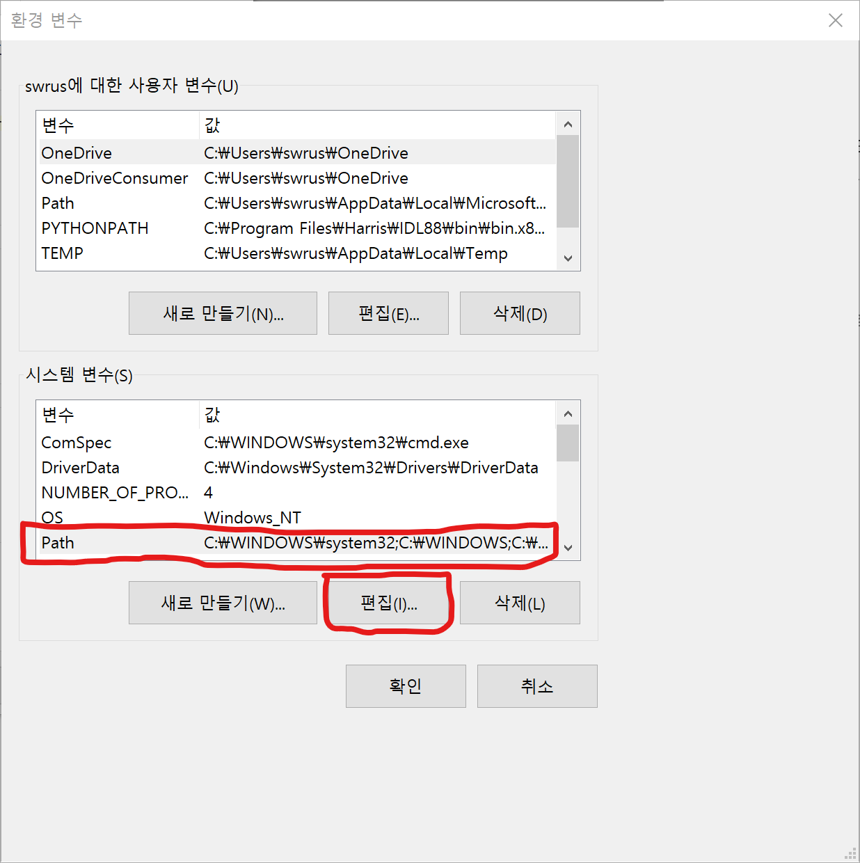 그리고 여기서 하단에 보이는 시스템 변수 내에서 'Path'라는 항목을 선택하고 '편집' 버튼을 클릭합니다.
