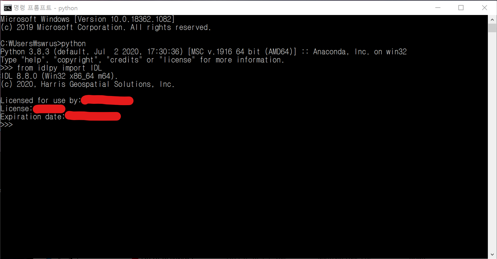 자 이제 이 과정까지 마쳤다면 셋업 과정은 다 마무리가 된 셈입니다(복잡하네요 ㅠㅠ). 이제 테스트를 위하여 Python을 실행하여 다음과 같은 명령이 문제없이 수행되는지 확인해보면 됩니다. 성공적으로 수행된다면 다음과 같이, 마치 IDL을 처음 띄웠을 때와 같은 IDL 관련 문구들이 뜨는 것이 보이게 됩니다. 다음 그림은 제가 cmd 프롬프트 상에서 Python을 실행하여 테스트한 모습입니다. 즉 Python 안에서 IDL 라이브러리를 불러온 것입니다.
