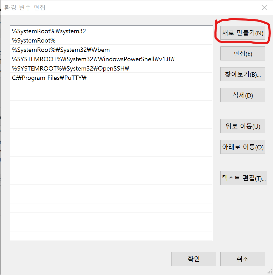 여기서 '편집' 버튼을 누르면 다음과 같은 새로운 창이 뜨는데 여기서 '새로 만들기' 버튼을 누릅니다. 새로운 디렉토리 경로들 몇 개를 더 추가하기 위해서입니다.