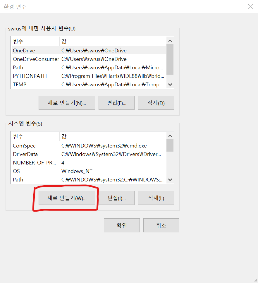 윈도우즈에서 이 과정에 대하여 좀 더 자세히 소개합니다. 먼저 윈도우즈의 제어판에서 '고급 시스템 설정'으로 가서 '환경 변수' 버튼을 눌러 해당 인터페이스로 들어갑니다. 여기서 하단의 시스템 변수 아래쪽에 있는 '새로 만들기' 버튼을 누릅니다.