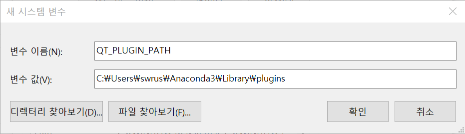그러면 시스템 변수에 새로운 항목을 추가할 수 있도록 해주는 팝업 인터페이스가 다음과 같이 뜨는데, 여기서 '변수 이름'에 QT_PLUGIN_PATH라는 항목 이름을 써주고 '변수 값'에 해당 내용을 입력합니다. 이 내용은 Python 또는 Anaconda가 설치된 디렉토리 경로에 맞춰줘야 합니다. 아래의 내용은 제 컴퓨터에 해당되는 예제입니다.