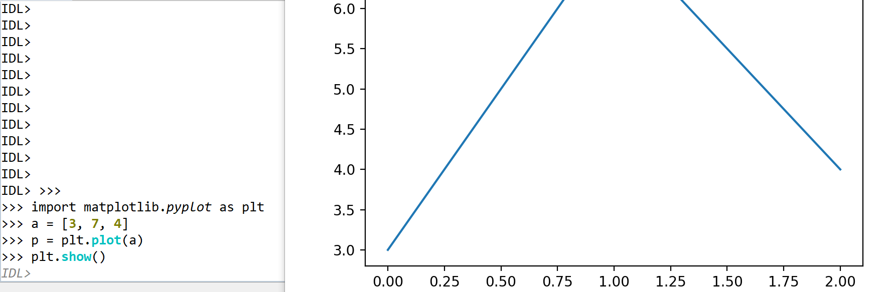 아마 여기서 설명된 과정을 그대로 따라간다면 셋업과 작동이 다 잘 되리라 생각되는데요. 그런데 제가 이렇게 셋업을 하고 잘 사용하던 와중에 생각지도 못했던 이슈와 마주치게 되었습니다. IDL 내에서 Python으로 들어가서 matplotlib 라이브러리를 사용하는 경우에 발생하는 이슈인데요. 이슈를 발생시킨 예제코드의 내용은 다음과 같습니다.