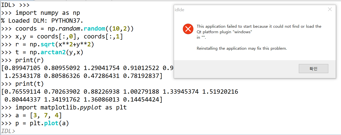 즉 이와 같이 This application failed to start because it could not find or load the qt platform plugin "windows" in "" 이라는 메시지의 팝업창이 뜨면서 실행이 중단되는 현상입니다. 여기서 확인 버튼을 누르면 아예 IDL도 강제종료가 되어버립니다. 사실 브릿지를 통하지않고 그냥 순수하게 Python 자체에서 해보면 발생하지 않는 문제입니다. 제가 Python으로 직접 들어가서 실행해본 모습은 다음과 같이 정상입니다.