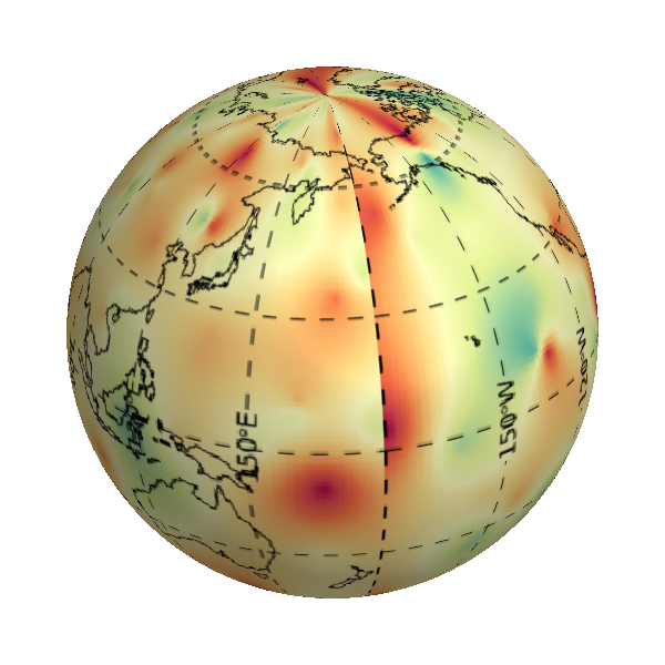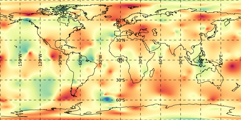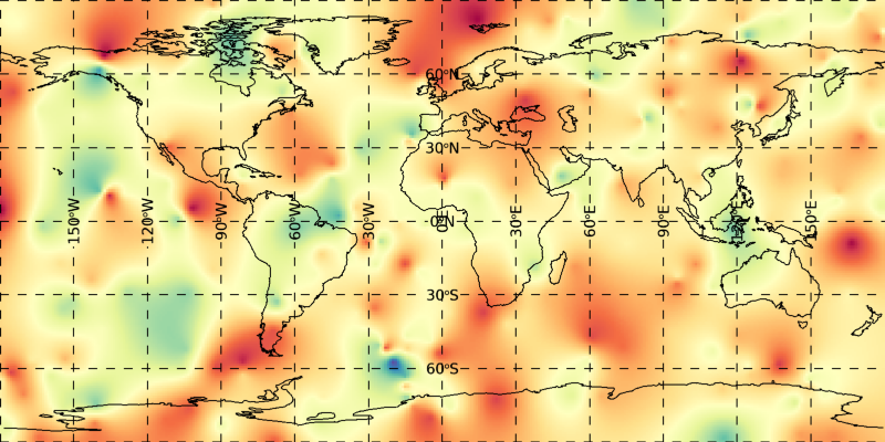 이 그림을 보면 경도가 +180 (또는 -180)인 부분에서 자오선을 따라 이미지의 불연속이 확연하게 드러납니다. 분명히 이것은 간과할 수 없는 문제입니다. 그리고 또 다른 문제도 있는데, 이 그림에서 북극 지역을 잘 보면 뭔가 길쭉한 형태의 패턴들이 북극점으로 수렴하는 것 같은 모습이 보입니다. 사실 이것 역시도 매우 부자연스러운 패턴입니다. 첫번째 문제는 결국 격자화 내삽의 과정에서 경도 +180과 -180이 서로 동일한 지점이라는 구체(Sphere) 표면의 특수성이 반영되지 않았기 때문에 발생한 것입니다. 그리고 두번째 문제도 맥락은 비슷합니다. 즉 경도선(수직 방향의)들의 간격이 극지방으로 갈수록 점점 좁아진다는 구체 표면의 특수성이 전혀 반영되지 않았기 때문에 발생한 문제입니다. 결국 우리가 얻은 내삽 결과는 사각형 평면에 가까운 공간에서라면 아무 문제가 없었겠지만, 지구 구체라는 입체적 형태의 표면이라는 기하학적 특성이 전혀 고려되지 않은 결과인 셈입니다.