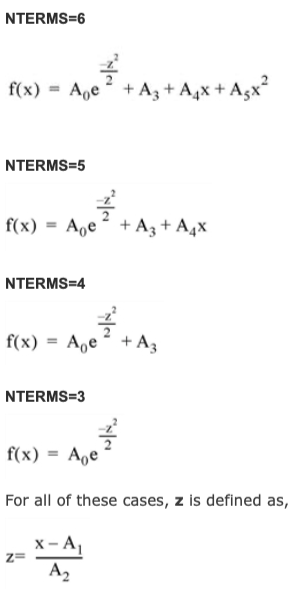이와 같은 인수값에 따른 구분은 실제로 GAUSSFIT 함수 내에서 NTERMS라는 키워드를 통하여 설정하게 됩니다. 즉 이 키워드의 값은 3, 4, 5, 6 중 하나가 됩니다. 이 키워드의 디폴트값은 6입니다. 즉 별다른 지정을 하지 않으면 6-term Gaussian 함수를 가정하여 처리됩니다. 따라서 근사하고자 하는 Gaussian 함수의 형태에 따라서 이 키워드의 값을 직접 명시적으로 설정하는 것이 필요할 수도 있습니다. 각 케이스별 바탕 수식의 모습은 다음과 같습니다.