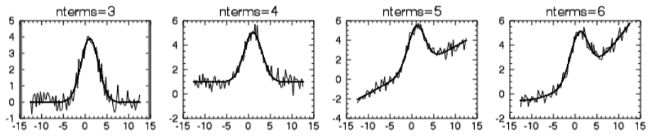 이 수식에서는 그 형태를 결정짓는 인자들이 a, b, c 세 개입니다. 그런데 IDL의 GAUSSFIT 함수에서는 이러한 3-term Gaussian 함수에 대한 근사 뿐만 아니라, 인자들이 더 많은 케이스들(4, 5, 6-term)에 대한 근사도 가능합니다. 즉 다음과 같이 기본적으로는 Gaussian의 형태를 가지면서 베이스라인의 형태가 다양한 일반적인 케이스들까지도 커버할 수 있습니다.