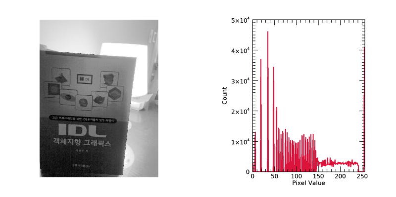 여기서 왼쪽의 이미지를 보면, 어두웠던 책 커버 부분의 명암대비가 강조되어 형체가 잘 식별됩니다. 여기까지는 앞서 클리핑 기법을 적용했을 경우와 거의 유사합니다. 그런데 책 커버 주변의 좀 밝았던 부분들도 명암대비가 강조되었을 뿐 아니라 잘 보이기까지 합니다. 클리핑 기법을 적용했을 경우에는 이 부분들은 형체가 사라졌던 반면, 지금은 특별히 형체가 유실된 부분은 거의 보이지 않습니다. 따라서 히스토그램 균일화 기법을 적용하면 특정한 화소값 범위에 대한 형체 정보를 잃지 않으면서도 전반적으로 명암대비가 높아지는 효과를 얻을 수 있게 됩니다.