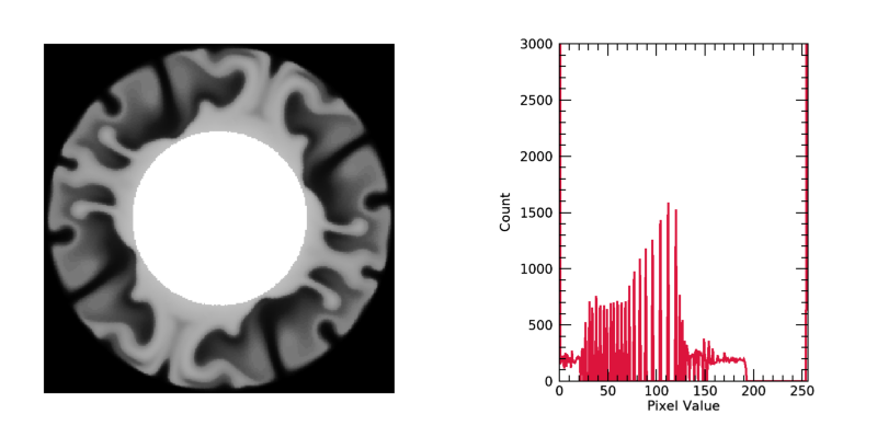 여기서 왼쪽은 원본 데이터 배열인 img를 이미지 형태로 표출한 것이고, 오른쪽은 img의 화소값 분포를 나타낸 분포도입니다. 분포도를 잘 보면 이미지 상에서 검은색으로 보이는 배경 부분에 해당되는 화소들이 갯수가 많으며 그 화소값은 0입니다. 또한 흰색으로 보이는 가운데 부분에 해당되는 화소들 역시 갯수가 많으며 그 화소값은 255입니다. 갯수가 많다보니 분포도의 Y축 범위가 너무 넓어지기 때문에 일부러 Y축의 범위를 0~3000으로 좁혀놓았습니다. 어쨌든 화소값이 0 및 255인 경우는 논외로 하고 나머지 화소값들에 대한 분포를 보면 대략적으로 0~120 정도의 범위 내에 분포하는 것을 볼 수 있습니다. 그러면 여기서 이제 히스토그램 균일화(Histogram Equalization) 기법을 적용해봅시다. 그 과정은 다음과 같습니다.