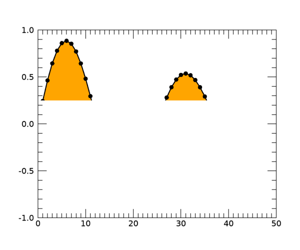 이 과정에서는 먼저 y_flat 배열의 값들이 모두 1.0으로 통일됩니다. 1.0은 Y축 범위의 최대값입니다. 그리고 흰색으로 채워진 플롯을 덧그릴 때 FILL_LEVEL 속성의 값을 0.25로 설정함으로써 0.25 윗 부분만 흰색으로 덮어지도록 합니다. 그러면 0.25 아랫 부분의 orange 색으로 채워졌던 부분은 그대로 살아남습니다. 그런 다음에 선과 심볼들만으로 구성된 p2 플롯을 덧그리면 됩니다. 그 결과는 다음 그림과 같습니다.