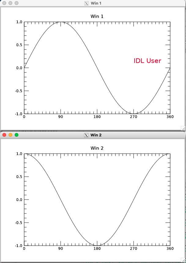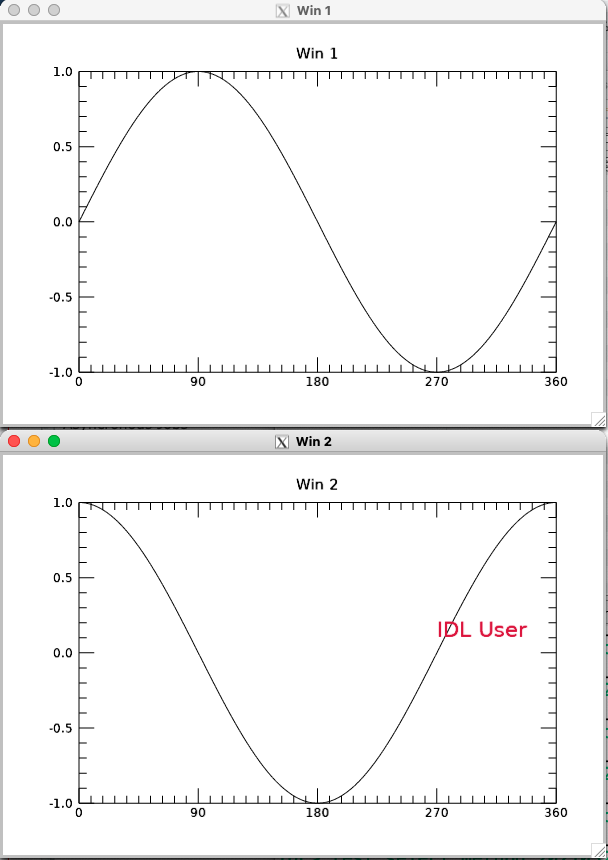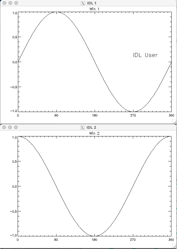 이와 같이 두번째 그래픽 창인 win2의 플롯 상에 'IDL User'라는 캡션 문자가 나타난 것을 확인할 수 있습니다. 두 개의 그래픽 창들(win1, win2) 중 win2가 선택된 이유는 TEXT 함수가 사용되기 직전 가장 최근에 뜬 그래픽 창이 win2이기 때문입니다. 즉 그 시점에서는 win2가 바로 "현재 활성화된" 그래픽 창이기 때문입니다.