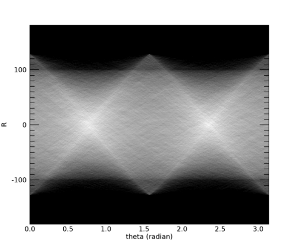 이것은 공간 도메인에 있던 원본 이미지 데이터를 라돈 도메인으로 변환한 것이기 때문에, 당연히 원본 데이터 이미지의 모습과는 완전히 다릅니다. 사실 라돈 도메인에서 왜 이런 모습이 되는가에 대해서 이해하려면 라돈 변환에 관한 기본적인 이론에 대한 이해가 필요한데, 여기서는 제가 이러한 내용까지 자세히 언급하기가 좀 힘듭니다. 이 부분에 대해서는 앞서 맨 처음에 제시했던 IDL 도움말의 내용을 참조하거나 아니면 웹상에서 검색 가능한 Radon transform에 관한 내용들을 참조하시기 바랍니다.