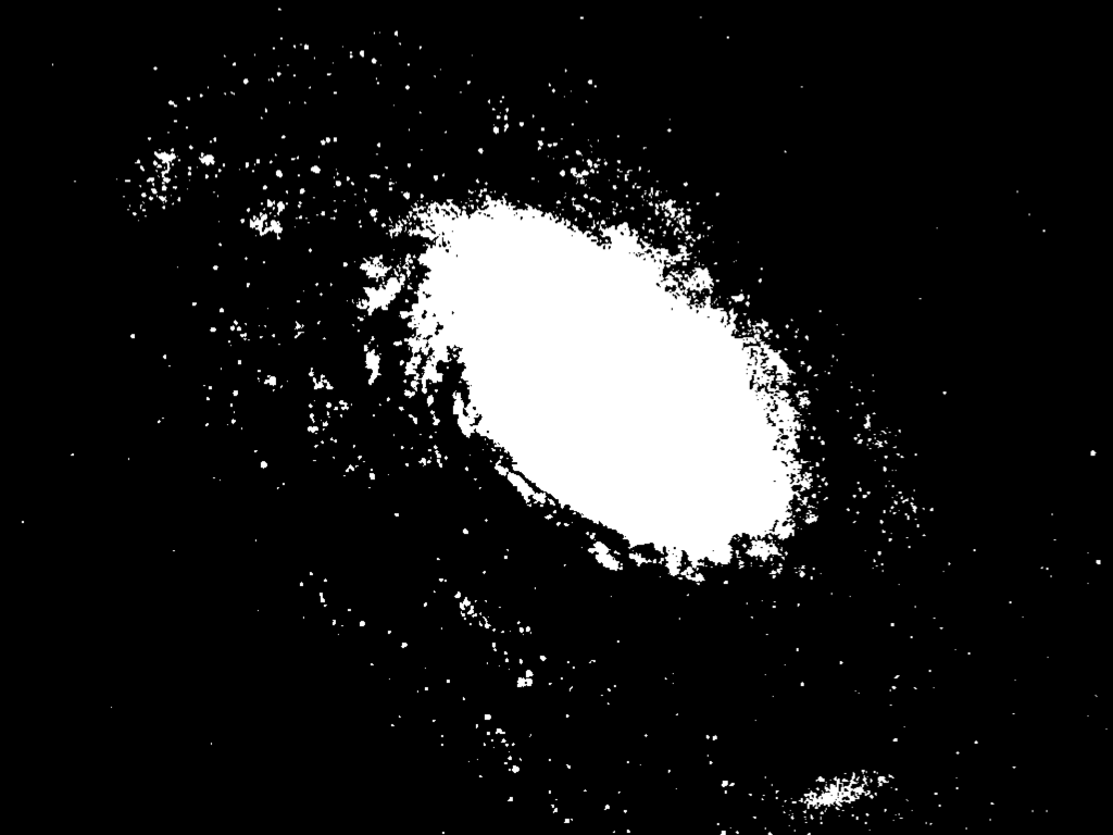 그런데 여기서 IMAGE 함수의 내용을 잘 보면 표출의 대상인 배열 mask에 정수 1을 곱했는데요. 원래 mask 자체는 바이트형 배열인데, IMAGE 함수의 대상이 바이트형 배열인 경우에는 값을 그대로 색상으로 반영합니다. 즉 0과 1의 값이 그대로 색상값 0과 1로 대응되어 표출되는데, 이렇게 되면 컬러테이블을 구성하는 256개의 색상들 중 맨 앞의 0번과 1번에 해당되는 두 색상이 사용됩니다. 그레이스케일의 색상들로 구성된 디폴트 컬러테이블에서는 0과 1 모두 완전 검정색에 가까우므로 육안으로는 두 색상의 구분이 거의 불가능합니다. 그런데 IMAGE 함수의 대상 배열의 자료형이 바이트형이 아닌 경우에는 최소값부터 최대값까지의 범위를 무조건 0~255의 색상값들로 대응시키는 바이트스케일링(Byte-Scaling)이 적용됩니다. 즉 배열값의 범위가 0~1인 경우 색상은 0~255로 대응되므로, 배열값 0은 색상값 0으로 그리고 배열값 1은 색상값 255로 표현됩니다. 그러면 0과 1이 각각 검정색과 흰색으로 표현되기 때문에 육안으로도 두 값을 서로 구분하여 보기가 쉬워집니다. 이러한 처리를 하기 위하여 일부러 mask*1로 표시한 것입니다. 즉 mask 자체는 바이트형이지만 mask*1은 정수형이 된다는 점을 이용한 하나의 요령이라고 보면 됩니다. 어쨌든 표출된 모습은 다음 그림과 같습니다.