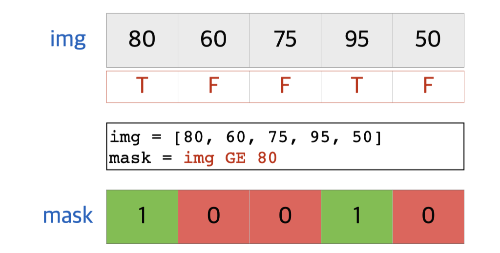 따라서 위의 두번째 줄의 내용의 의미는, img라는 배열의 모든 값들에 대하여 80보다 크거나 같다(Greater than or Equal)는 조건는 만족하는지 여부를 일일이 확인하고 그 결과를 mask라는 배열로 담으라는 것입니다. 판단의 결과는 1 또는 0으로 얻어집니다. 즉 조건을 만족하는 경우에는 1이 되고, 그렇지 않은 경우에는 0이 됩니다. 결국 mask라는 배열은 1 또는 0의 값들로 구성된 배열이 됩니다. 실제로 PRINT 명령에 의하여 출력된 내용은 다음과 같습니다.