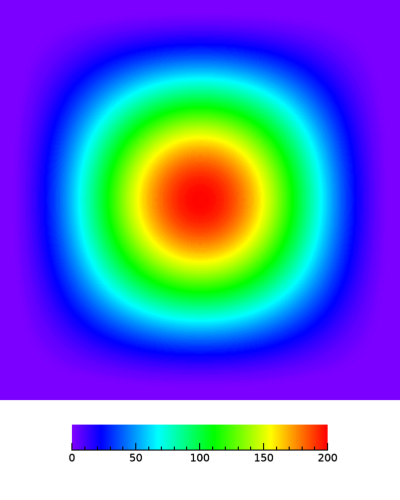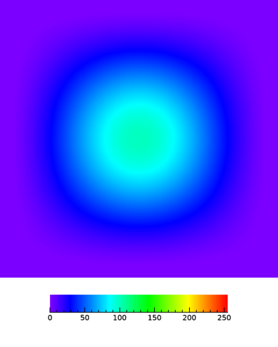 이 그림을 보면 우리가 바로 앞서 값 범위가 0~100인 데이터를 표출했던 경우와 차이가 거의 나지 않습니다. 정확히 얘기하면, 이미지에서 사용된 색상들이 컬러테이블의 모든 색상들(0~255)이란 점은 동일합니다. 다만 하단의 컬러바에 표시된 데이터 값 범위가 아까는 0~100이었지만 이번에는 0~200이 되었다는 차이 뿐입니다. 결국은 앞서 이미 언급했듯이 IMAGE 함수에 투입되는 이미지 데이터 배열의 자료형이 실수형일 경우에는 배열 값 범위가 원래 어떻든간에 표출에 있어서 컬러테이블의 모든 색상들(0~255)이 사용된다는 규칙이 적용된 모습이라고 볼 수 있습니다. 그리고 이러한 특성은 이미지 데이터의 자료형이 정수형인 경우에도 마찬가지입니다. 즉 IMAGE 함수에 투입되는 이미지 데이터 배열의 자료형이 정수형일 경우에도 배열 값 범위가 원래 어떻든간에 표출에 있어서 컬러테이블의 모든 색상들(0~255)이 사용된다는 규칙은 동일하게 적용됩니다. 이러한 경우에 대해서는 다음과 같이 배열 data를 정수형 배열로 정의하여 테스트해볼 수 있습니다.
