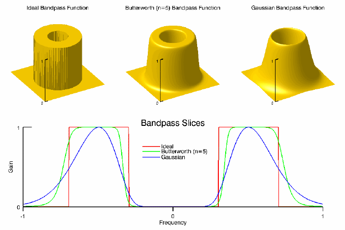 그러한 기법들 중 하나인 밴드패스(Band Pass) 알고리즘에서는 주파수 도메인 상에서 특정한 주파수 범위를 통과(Pass)시키고 나머지는 통과시키지 않습니다. 즉 특정 주파수 범위만 살리고 나머지는 제거한 상태에서 역변환 처리를 하는 기법이라고 보면 됩니다. 이러한 기법을 사용하려면 BANDPASS_FILTER 함수를 사용하면 되는데, IDL 도움말에서 이 함수에 관한 내용을 보면 밴드패스의 방식에 대한 도식적인 그림도 볼 수 있습니다. 여기서도 첨부해봅니다.