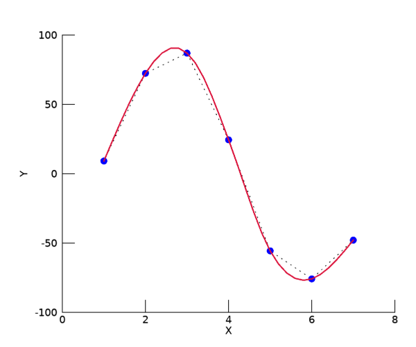 그리고 다음과 같이 INTERPOL 함수를 /SPLINE 키워드와 함께 사용하면, 각 구간별로 인접한 4개의 포인트들을 3차 곡선으로 이어주면서도 구간과 구간 사이를 부드럽게 이어주는 3차 스플라인 내삽(Cubic Spline Interpolation) 기법이 적용됩니다.