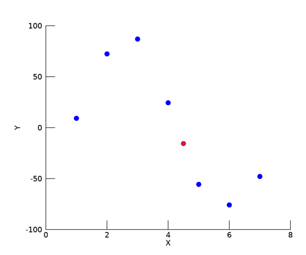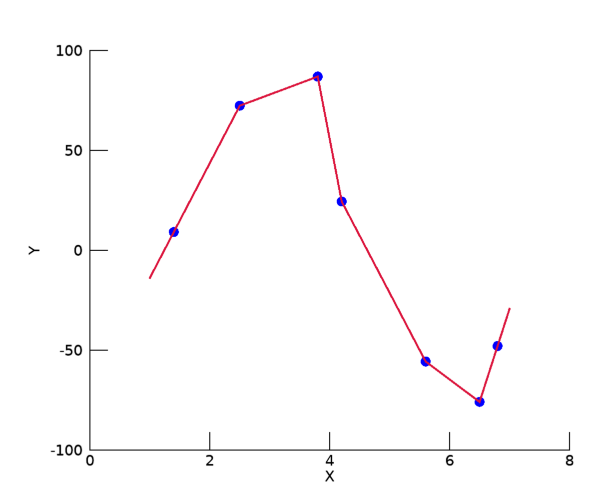 그리고 한가지 경우만 더 언급하자면, 데이터 포인트들의 간격이 반드시 일정하지 않아도 됩니다. 즉 앞선 예제들에서는 원본 데이터의 X 값들의 간격이 1.0으로 일정했는데, 다음과 같이 불규칙한 간격의 값들일 경우에도 결과를 얻을 수 있습니다.