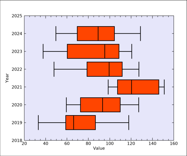 이와 같이 data 배열은 6x5의 형태를 갖는 2차원 배열인데 여기서 6은 데이터 세트의 갯수에 해당되고 5는 5종의 통계값들에 해당됩니다. 즉 BOXPLOT 함수는 Mx5의 형태(M은 데이터 세트의 갯수)로 정의된 배열을 인수로 받을 수 있다는 것을 유의해야 합니다. 그리고 함께 정의된 x는 6개의 데이터 포인트들 각각에 대응되는 연도값들(2019~2024)로 구성된 1차원 배열입니다. 이 상태에서 BOXPLOT 함수를 다음과 같이 사용해봅시다.