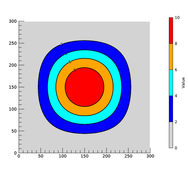 이 그림에서는 특히 오른쪽의 컬러바를 주목해야 합니다. 이제는 컬러바에서도 각 색상이 값 자체가 아닌 값 범위에 대응되는 형태로 표출된 것을 확인할 수 있습니다. 즉 눈금값이 컬러 마디의 중심이 아닌 각 마디에 표시된 것입니다. 그리고 컬러바의 마디에 해당되는 값들은 이제 2, 4, 6, 8 뿐 아니라 최대치인 10까지도 표시되었지만, 추가된 색상인 black은 실제로는 표시되지 않습니다. 어차피 최대치를 넘는 값은 존재하지 않기 때문에 실제로는 사용되지 못한 셈입니다. 어쨌든 이러한 요령을 사용하면 우리가 의도했던 결과를 얻을 수 있음을 확인할 수 있습니다.
