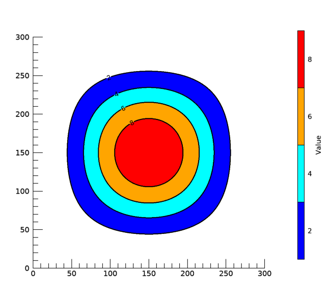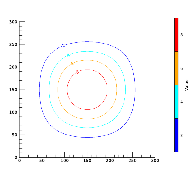 여기서는 먼저 300x300의 구조를 갖는 2차원 배열을 생성했는데 값 범위는 0~10입니다. 그래서 등위선을 표출하는데 있어서 2, 4, 6, 8이라는 4개의 값들에 대한 선만 표출되도록 하면서 4개의 색상도 함께 정의하여 각 값에 대하여 색상이 대응되도록 하였습니다. 이렇게 값과 색상을 설정하는데 있어서는 CONTOUR 함수의 C_VALUE 및 C_COLOR 속성을 사용하였습니다. 그리고 바로 이어서 COLORBAR 함수를 사용하여 컬러바를 표출하였는데, 일단 ORIENTATION 속성을 1로 설정하여 세로 방향의 컬러바가 되도록 하였습니다. 또한 NG 체계의 등위선 그래픽에 대한 컬러바가 표출될 때 디폴트로 두면 끝부분이 뾰족해지는 형태가 되는데, 여기서는 TAPER 속성을 0으로 설정함으로써 그냥 사각형이 되도록 처리하였습니다. 이 과정을 실행하면 그 모습은 다음과 같습니다.