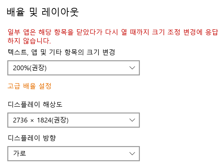 이 파일의 경우 화소 크기는 600x500이긴 하지만 그 모습을 보면 문자들이 원래 의도했던 것보다 너무 크게 표시되어서 이와 같이 화면이 모자란듯한 느낌을 줍니다. 실제로 이 그림에서는 Y축 타이틀 문자는 아예 그림 바깥으로 벗어나있습니다. 이러한 현상의 원인은 IDL이 설치된 PC의 디스플레이 설정과 관련이 있습니다. 특히 태블릿 계열의 PC들에서 흔히 존재하는 "배율"이라는 요소가 주된 원인인 것으로 보입니다. 실제로 위의 그림은 제가 서피스 프로 4(Surface Pro 4)에 설치된 IDL을 사용하여 얻은 PNG 파일의 모습입니다. 이 기기의 디스플레이 설정을 보면 실제로 다음과 같습니다.