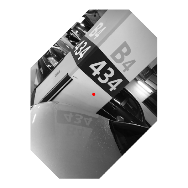 이 과정에서는 /INTERP 키워드를 함께 사용하여 확대의 과정에서 Bilinear Interpolation 기법이 적용되도록 하였습니다. 그러면 좀 더 부드러운 결과 이미지를 얻을 수 있습니다. 지금까지의 예제들에서는 모두 시계 방향 45도 회전을 적용하였는데, 회전의 기준점은 이미지의 한가운데였습니다. 즉 다음 그림에서 보는 바와 같이 이미지의 한가운데 지점(빨간색으로 표시)을 기준으로 한 회전이 적용되었습니다.