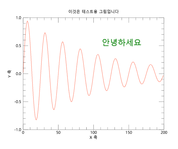 이 방법은 제가 윈도우즈 PC에 설치된 IDL을 기준으로 설명하였지만, Mac OS에서도 적용이 가능합니다. 제가 실제로 윈도우즈 PC에서 가져온 malgun.ttf 파일을 Mac OS 머신으로 가져와서 사용해보았더니 잘 작동하였습니다. Mac OS의 경우는 IDL의 폰트 디렉토리 경로가 /Applications/harris/idl88/resource/fonts/tt가 된다는 것만 다를 뿐 나머지 셋업 과정들은 똑같습니다. 위와 똑같은 프로그램을 Mac OS용 IDL에서 실행하여 얻은 그림은 다음과 같습니다.