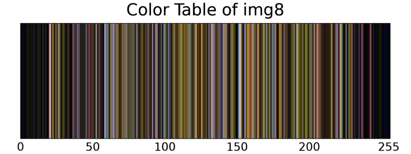 그리고 여기서 한가지만 더 살펴보고 싶은 것이 있는데, 바로 img8이라는 8비트 이미지가 갖고 있는 고유의 컬러테이블의 실제 모습입니다. 여기서는 제가 얼마 전에 올렸던 "컬러테이블만 표출하는 방법"이라는 게시물에서 소개한 방법을 그대로 사용하여 표출해봅시다. 그 과정은 다음과 같습니다.