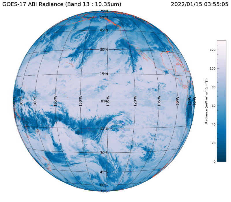 그리고 오늘 소개한 내용에서 사용했던 예제 데이터의 날짜가 UTC로 2022년 1월 15일 03시 50분이었는데, 사실 이 때가 통가(Tonga) 화산 폭발이 있었던 시점인 04시 직전에 해당됩니다. 그래서 제가 03시 50분부터 11시 50분까지 7시간에 걸친 데이터들을 읽어서 동영상으로 만들어보았는데, 이 동영상은 아래 링크에서 보실 수 있습니다. 왼쪽 하단의 노란색 사각형이 바로 화산 폭발이 발생했던 부분입니다. 참고로 봐주시기 바랍니다.