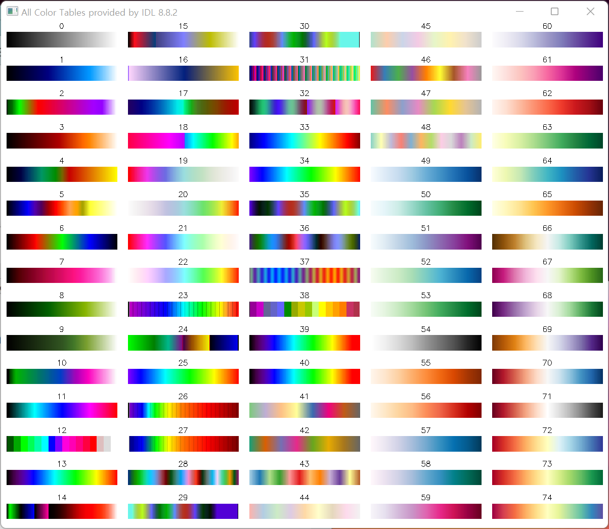 이 프로그램을 받아서 실행해보면 DG 기반의 그래픽창이 하나 뜨고 IDL에서 기본 지원되는 75개의 모든 컬러테이블들을 한꺼번에 볼 수 있습니다. 또한 각 컬러테이블의 번호도 함께 볼 수 있습니다. IDL 8.8.2에서 이 프로그램을 실행한 모습은 다음과 같습니다.