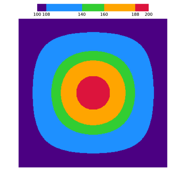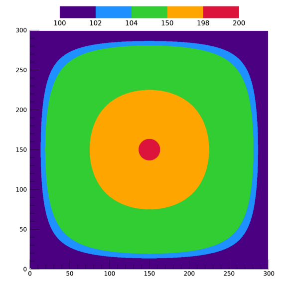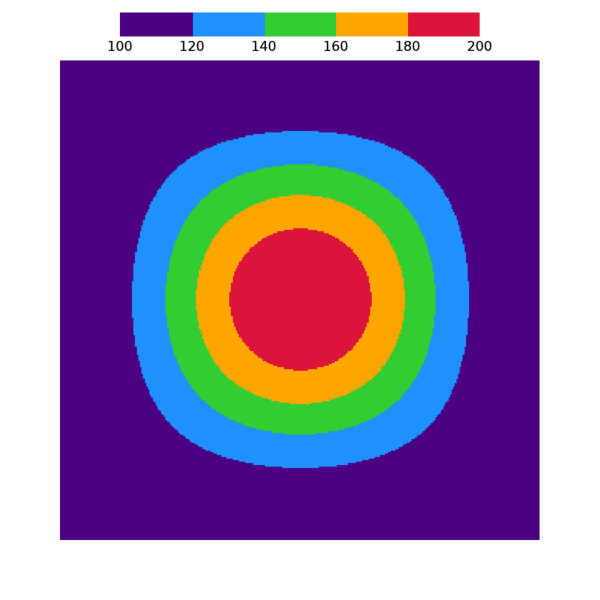 결국 이 결과는 100~200의 값 범위를 갖는 2차원 데이터를 이미지의 형태로 표출하는데 있어서 간격이 일정한 5개의 세부 구간들(100~120, 120~140, 140~160, 160~180, 180~200) 각각을 다른 색상으로 표시하기 위하여 5개의 색상들로 구성된 불연속적 컬러테이블을 적용하여 얻은 것입니다.