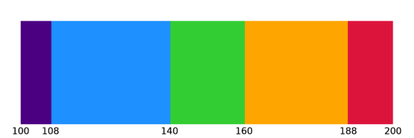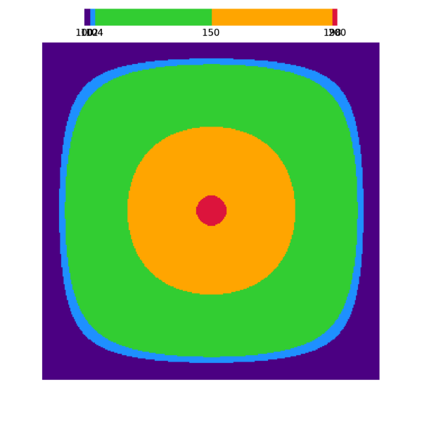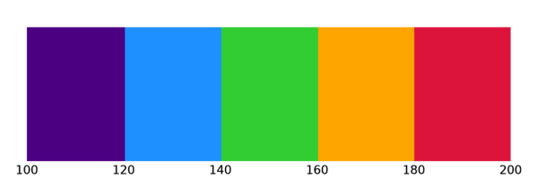 예를 들어서 어떤 종류의 2차원 데이터가 있는데 유효한 값의 범위가 100~200인 경우를 가정해봅시다. 이 데이터를 이미지 또는 등위선과 같은 2차원적 형태로 표출하고 컬러바를 함께 표시하고자 합니다. 그런데 이 컬러바는 100~200 범위 내에서 여러 개의 세부 구간들로 나눠지고 각 구간별로 색상이 부여되는 방식을 따르고자 합니다. 그리고 이러한 세부 구간들의 간격이 일정하지 않은 경우를 가정해보는 것입니다. 즉 불규칙한 세부 구간들로 나눠지고 불연속적인 색상들로 구성된 컬러테이블을 사용하여 표출하는 경우가 됩니다. 사실 컬러테이블 내에서 데이터의 구간들은 통상적으로는 간격이 일정하도록 표출하는 경우가 많습니다. 예를 들면 다음과 같이 100~200의 유효범위 내에서 일정한 크기(20)의 간격을 갖는 세부 구간들로 분할된 형태입니다.