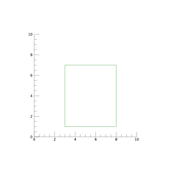 여기서 MESH_OBJ 명령에서는 Type에 해당되는 5라는 값을 첫번째 인수로 주는 것 외에도 입력 인수 arr 및 키워드 P2가 사용되고 있습니다. 그리고 명령이 실행된 후 그 결과를 vertices, polygons로 돌려받게 됩니다. Type 5에서 정의되는 폴리곤은 앞서 언급했듯이 마치 단면이 다각형인 압출 기둥과 같은 형태를 띄게 되는데, 이를 위해서는 단면이 될 다각형의 형태를 사전에 정의하여 입력 정보로 제공해야 합니다. 여기서는 arr이라는 3x5 구조의 2차원 배열로 정의되었는데, 이것은 XY 평면상에서 X 방향으로 3~8 그리고 Y 방향으로 1~7의 범위를 가지며 Z 방향으로 높이 2에 위치하는 사각형에 대한 꼭지점 좌표값들로 구성되었습니다. 그리고 키워드 P2에는 압출의 방향 및 크기에 대한 정보가 주어져야 합니다. 여기서는 Z 방향으로 6만큼 이동시켜서 압출하라는 의미입니다. 따라서 생성될 폴리곤은 Z 방향으로는 2~8의 범위를 갖게 됩니다.