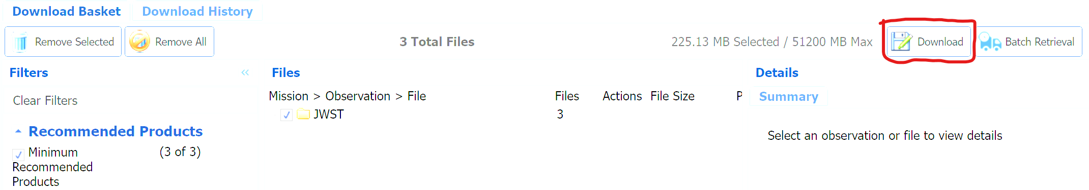 이 웹페이지에서는 파일을 선택할 때마다 그 데이터가 공간상으로 어느 부분을 본 것인지를 우측의 이미지 및 영역 표시를 통하여 확인할 수 있습니다. 따라서 우리가 선택한 데이터 파일들이 은하 중심부에 해당됨을 확인할 수 있습니다. 파일들의 선택이 끝난 후에는 장바구니 버튼을 눌러서 파일들을 담고 다운로드 버튼을 눌러서 ZIP 파일로 된 파일 묶음을 받으면 됩니다. 아니면 각 파일에 대하여 다운로드 버튼(디스켓 모양 아이콘)을 눌러서 개별 다운로드를 해도 됩니다.