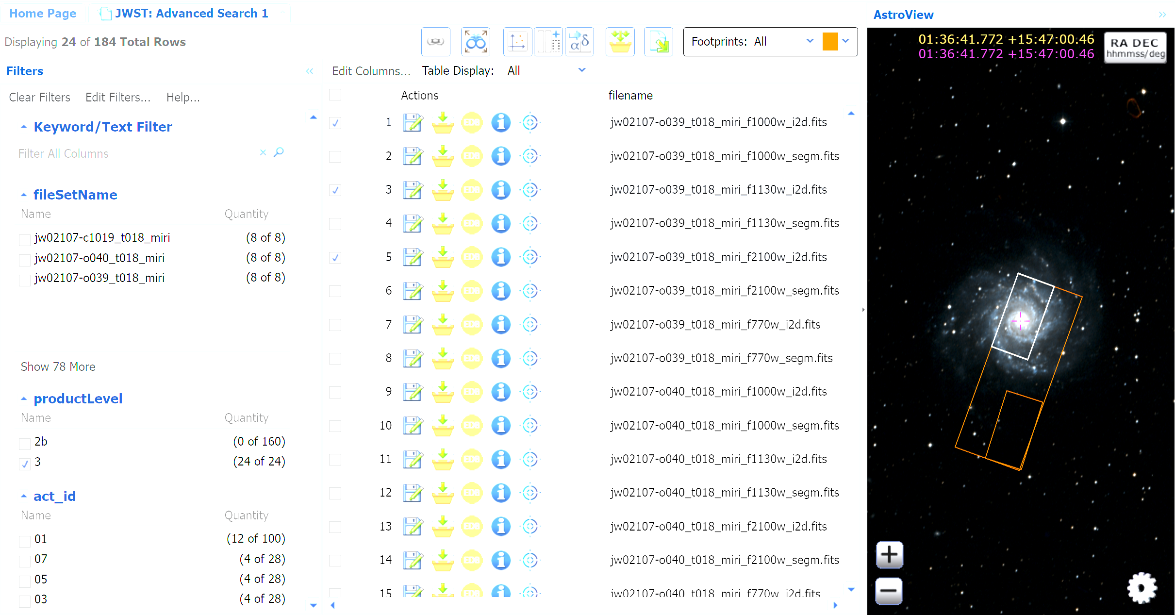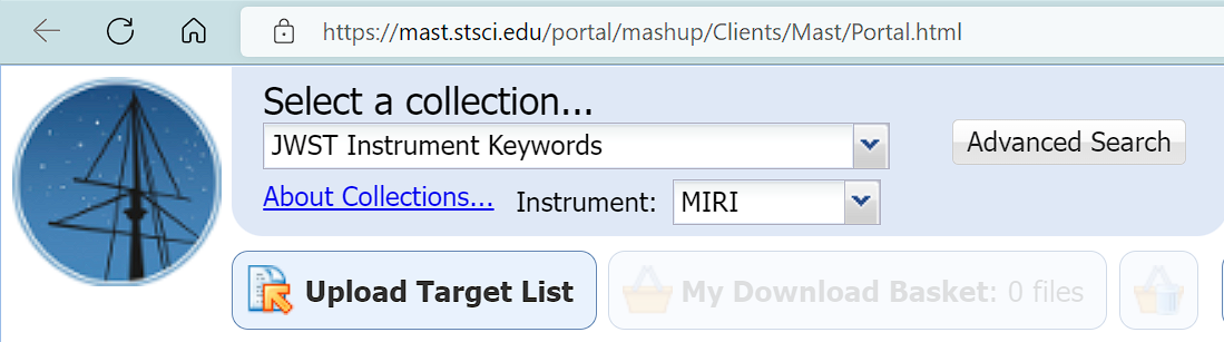 현재 JWST 데이터는 MAST(Mikulski Archive for Space Telescopes)라는 포탈 웹사이트를 통하여 제공되고 있습니다. 이 웹페이지에서는 계정 등록이나 로그인 절차 없이도 데이터의 조회 및 다운로드가 가능하게 되어 있습니다. 물론 각종 알림 및 좀 더 깊이있는 서비스를 받기 위해서는 해당 웹페이지에서 따로 계정 등록을 할 수도 있습니다. 어쨌든 MAST 웹사이트에서 상단을 보면 유저 인터페이스가 보입니다. 여기서 Select a collection에 대해서는 JWST Instrument Keywords를 선택하고 Instrument에 대해서는 MIRI를 선택한 후 Advanced Search 버튼을 누릅니다. 참고로 MIRI는 Mid-Infrared Instrument라는 탑재 장비 이름의 약자입니다.