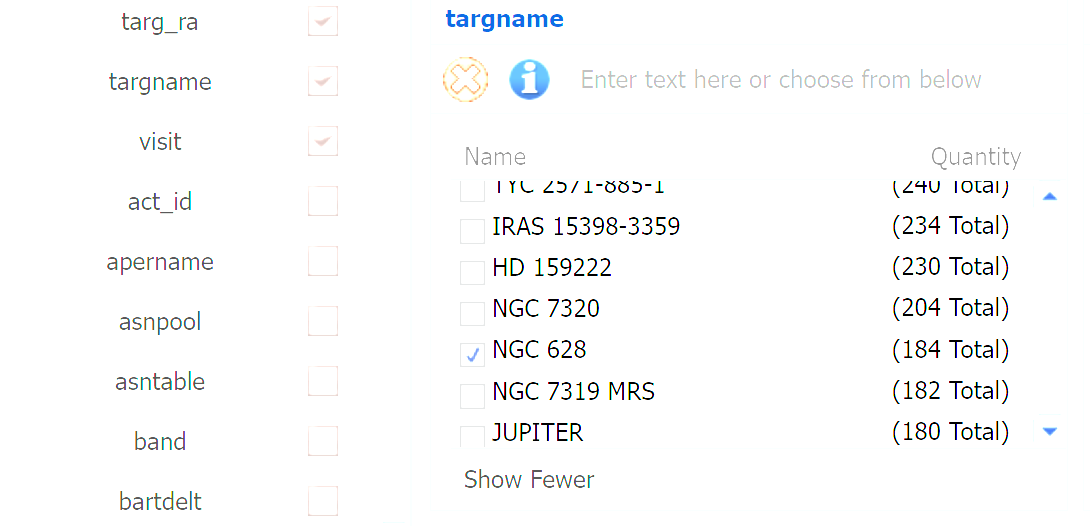Advanced Search 버튼을 누르면 새로운 팝업창이 뜨는데 여기서 하단부에 있는 각종 필터 옵션들 중 targname이라는 항목(Target Name이라는 의미)의 리스트로 가서 Show More 버튼을 누르고 관심 대상을 선택합니다. 여기서는 다음과 같이 NGC 628을 선택하였습니다.